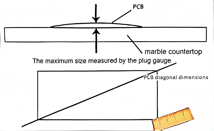 Place the PCB on a flat marble countertop or a glass plate with a thickness greater than 5MM, and use a plug gauge to measure the maximum size of the corner.
